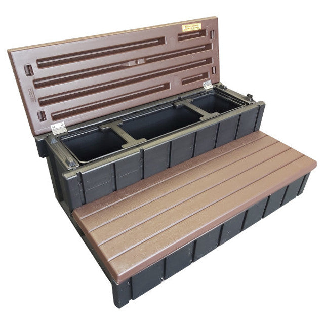 Spa steps are the most convenient way to enter and exit your hot tub. These steps have a handy storage compartment inside the top step as well as slip resistant treads for added security and safety. They are made with maintenance free plastic for long lasting enjoyment.