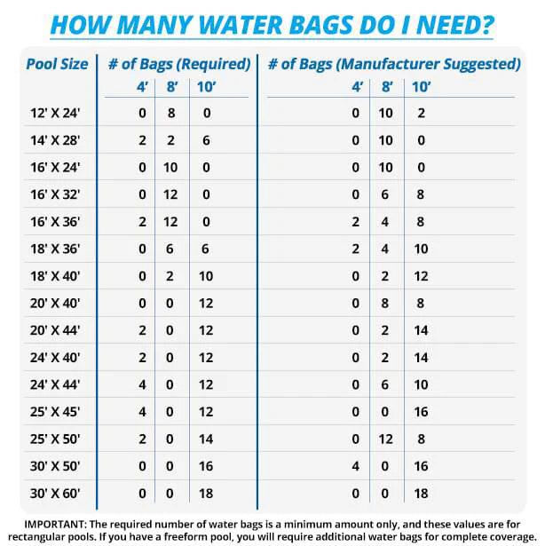 Water bags or tubes are specifically made to secure the winter cover on in-ground swimming pools. These bags come in various material thicknesses ranging from 4 mil to 18 mil and are priced accordingly. The durability and lifespan of the bags depend on the thickness of the material. Thicker 18 mil vinyl is much more durable and long-lasting compared to the very thin and easily torn 4 mil vinyl, making the 18 mil bags a better value in the long run.